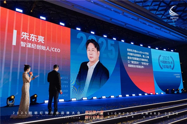 智谋纪AI照明凭借创新性的品牌影响力和AI技术底蕴,连续两年获得行业细分领域“AI照明领军品牌” 奖项,智谋纪创始人朱东亮先生获评 “2025中国照明灯饰行业年度创新人物”。